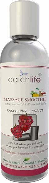 Diviértete con tu pareja con este aceite de masaje con efecto calor que aumenta al soplar en la zona, y un sabor exquisito y diferente, mezcla de frambuesa y regaliz. Contiene un ligero efecto de lubricación y es apto para la zona genital. Es 100% natural y 100% comestible. Es ecológico y orgánico, de la marca Catchlife, especialista en lubricantes y aceites.