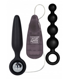 Kit formado por un plug y unas bolas anales realizados en silicona. Incluye una bala vibradora para poder intercambiar entre los dos juguetes. Funciona con dos pilas AAA.