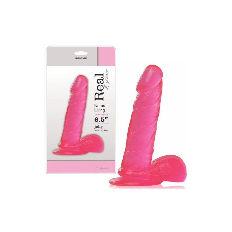 Dildo realista con ventosa y elaborado en gelatina de color rosa. Flexible y agradable al tacto.