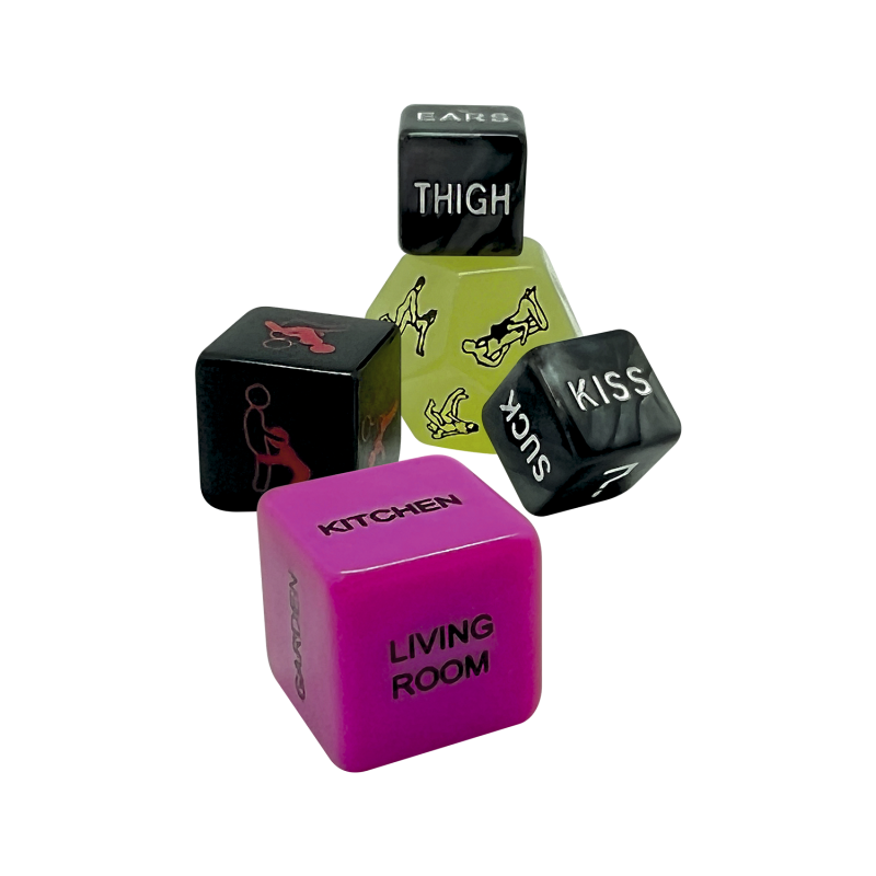 Set de 5 dados para romper el hielo e intensificar la atmósfera sexual… Al tirar los dados se determinará un juego de caricias a compartir con tu pareja.